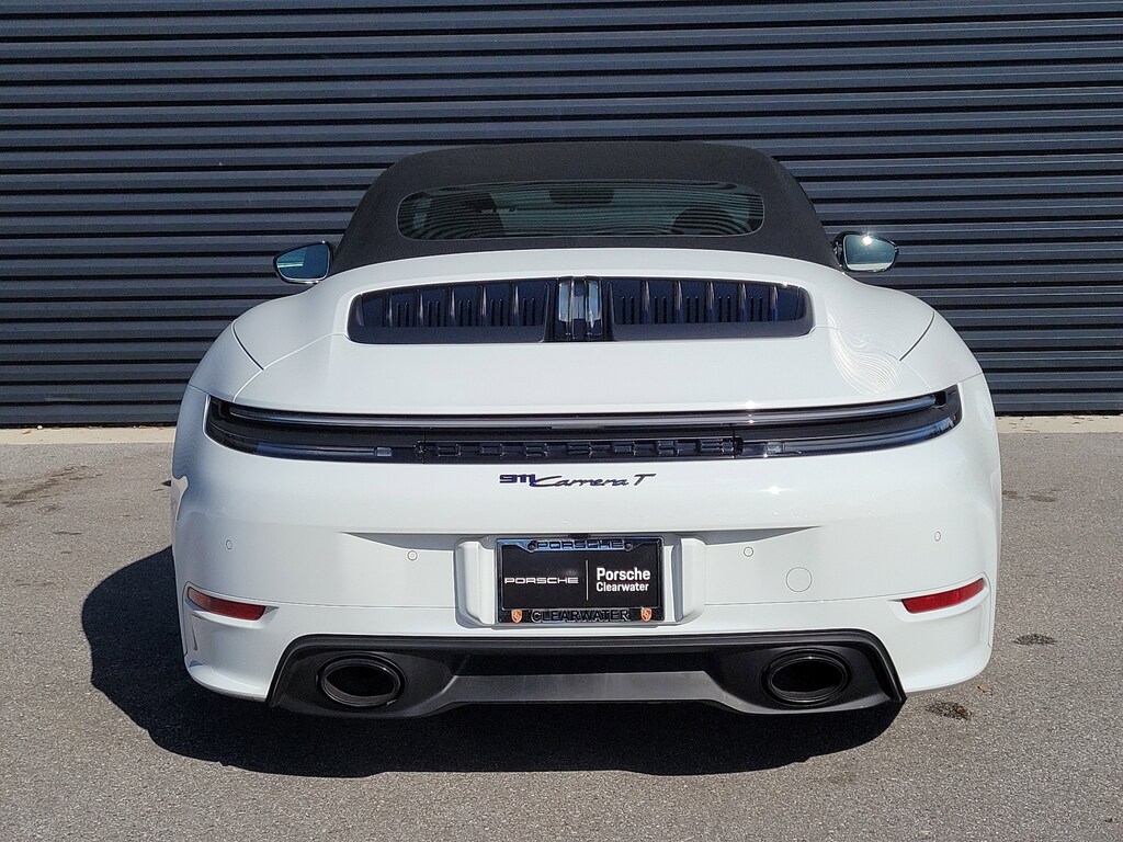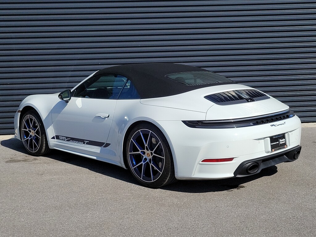 This Porsche Approved 2025 911 Carrera T Cabriolet is finished in White over the Plaid Carrera T Interior Package in Gentian Blue with a Black cabriolet roof and a 6-speed manual transmission.