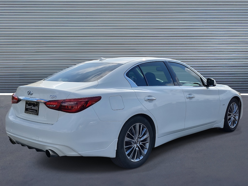 Pure White 2019 INFINITI Q50 3.0t LUXE 18" x 7.5" Aluminum Alloy Wheels, 4-Wheel Disc Brakes, 6 Speakers, 60/40 Split-Folding Rear Seats, Air Conditioning, AM/FM radio: SiriusXM, Anti-whiplash front head restraints, Auto-dimming Rear-View mirror, Automatic temperature control, Brake assist, CD player, Compass, Delay-off headlights, Driver door bin, Driver Seat Power Lumbar, Dual front impact airbags, Dual front side impact airbags, Electronic Stability Control, Essential Package (3.0t LUXE), Four wheel independent suspension, Front anti-roll bar, Front Center Armrest, Front dual zone A/C, Front fog lights, Heated door mirrors, Heated Front Seats, Heated Steering Wheel, INFINITI InTouch Navigation System, Low tire pressure warning, Overhead console, Panic alarm, Passenger vanity mirror, Power door mirrors, Power driver seat, Power moonroof, Power passenger seat, Power steering, Power windows, Radio data system, Radio: AM/FM/HD/CD w/MP3 Playback Capability, Rain sensing wipers, Rear reading lights, Rear window defroster, Remote Engine Start, Remote keyless entry, Security system, Speed control, Speed-sensing steering, Steering wheel mounted audio controls, Tachometer, Telescoping steering wheel, Traction control. This 2019 INFINITI Q50 3.0t LUXE won't last long!! Please call us or stop by today and take a closer look!!Priced below KBB Fair Purchase Price! 20/29 City/Highway MPG Odometer is 31530 miles below market average!Awards: * 2019 KBB.com 10 Best Luxury Cars Under $35,000 Bert Smith Automotive has been serving the St. Petersburg community for over 40 years!!